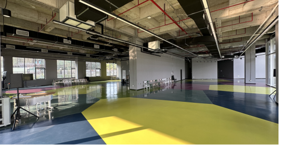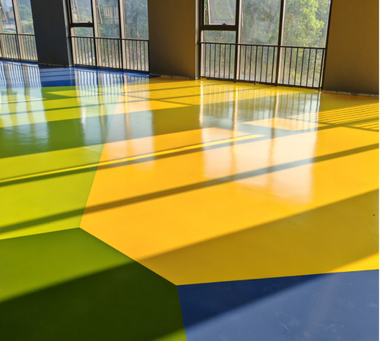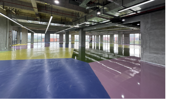 采用多種地坪漆拼色的做法,在金剛砂地面的基礎上完成創(chuàng)作,以植物常青藤的顏色作為設計靈感,用泰森多邊形的分割手法將地面分割成若干區(qū)域,在用不同顏色的地坪漆多次滾涂上色,成品堅固耐磨,獨具特色。